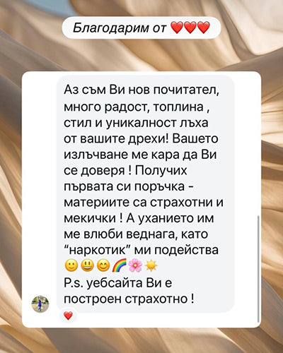 Аз съм Ви нов почитател... Много радост, топлина и стил лъха във вашите дрехи. ... материите са страхотни и мекички!