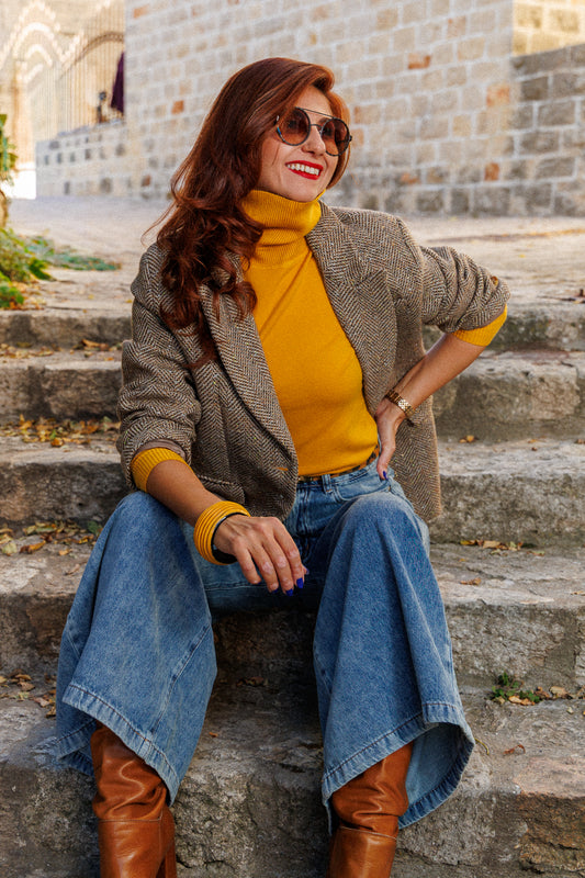 A lovely jacket in an amazing timeless cut and style. It also works well as a short coat. Delicate golden threads. Collar, lapels, front pockets and front fastening. Class, style and timeless sophistication that does not obey trends. Beautiful lining in the same color.