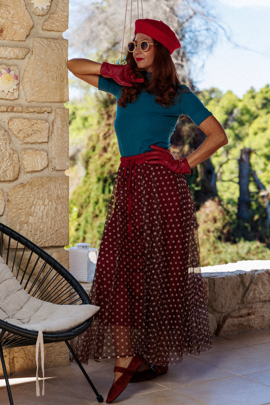 Beautiful satin elastic at the waist with a decorative tie, lining, gorgeous tulle polka dot cover and a lovely cut.